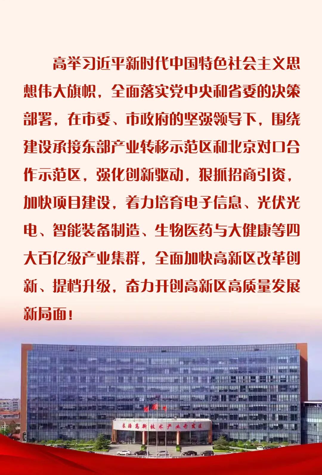山再高,往上攀,总能登顶;路再长,走下去,定能到达。长治高新区将在省委、省政府和长治市委、市政府的坚强领导下,同心协力、同甘共苦、同舟共济,一鼓作气、一往无前、一抓到底,建设两大示范区,争创百强高新区,奋力谱写高新区高质量发展和现代化建设新篇章!