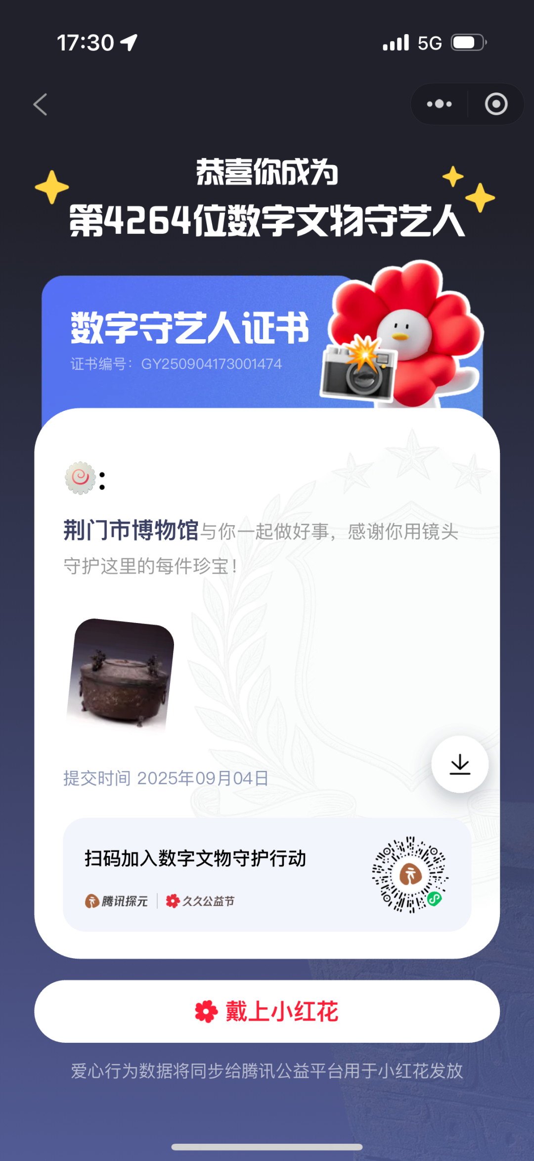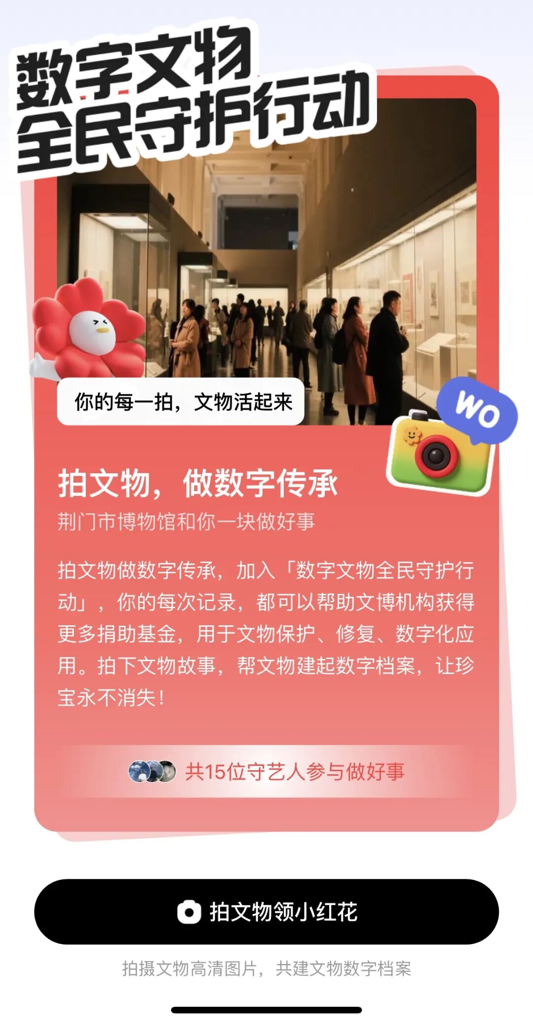 为促进文化传承与公益行动深度融合,荆门市博物馆与腾讯“久久公益节”推出“数字文物全民守护行动——扫码做好事,带上小红花”活动,以“科技+文物+公益”的创新模式,开启“全民参与文物数字化”的全新模式。