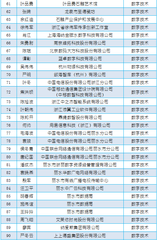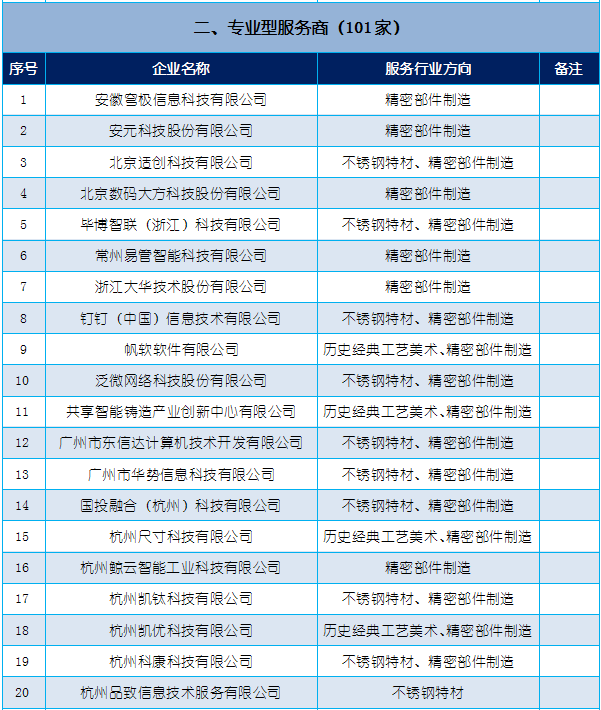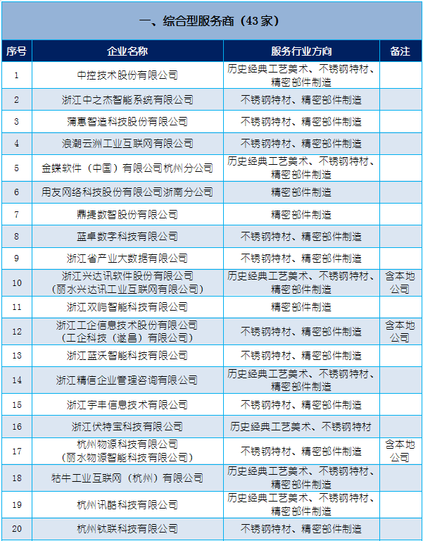 根据丽水市人民政府办公室《关于印发丽水市中小企业数字化转型城市试点建设实施方案的通知》,经自主申报、县(市、区)推荐、评选评审、社会公示等程序,确定丽水市中小企业数字化转型城市试点综合型服务商43家、专业型服务商101家、专家130名,现将名单予以公布: