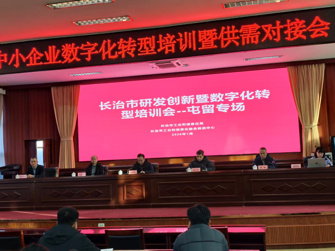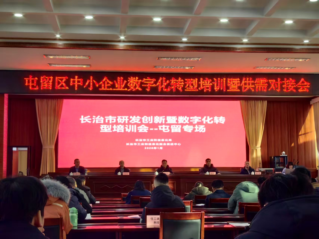 为加快推进中小企业数字化转型步伐,助力企业提升生产效率与管理水平,2026年1月7日上午,由长治市工业和信息化局主办的“屯留区中小企业数字化转型培训暨供需对接会”在屯留区宾馆成功举办。市工信局相关领导、屯留区工信局负责人、数字化转型工作专班成员、数字化改造服务商代表及屯留区45家重点企业代表参加了本次会议。