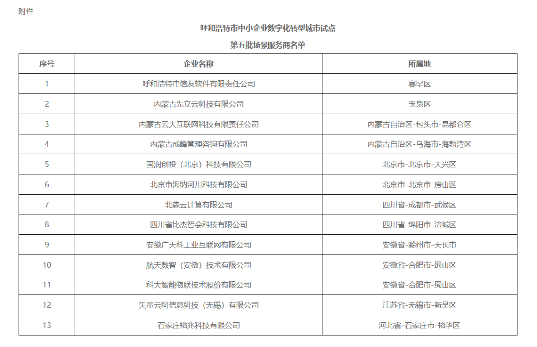 关于第五批呼和浩特市中小企业数字化转型场景服务商的名单公示